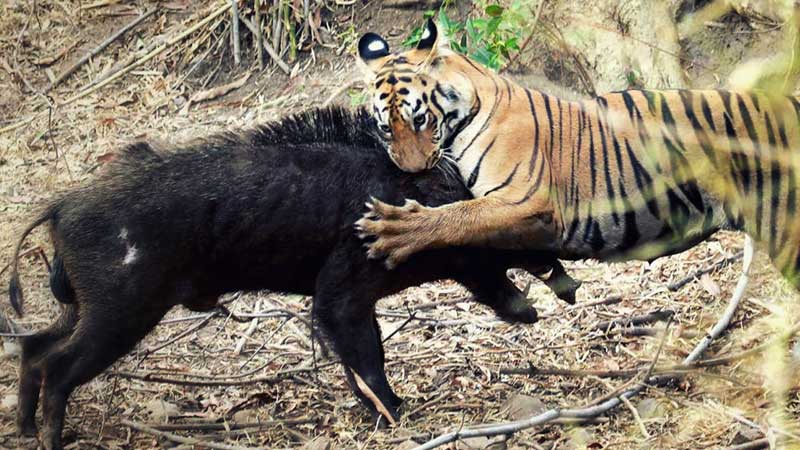 Несмотря на огромную силу и развитые органы чувств, тигру приходится много времени уделять охоте, поскольку успехом завершается только одна из 10 попыток. Он ползком подбирается к своей жертве, двигается при этом особенным образом: выгнув спину и упираясь задними лапами в землю. Мелких животных он умерщвляет, перегрызая горло, а крупных сначала валит на землю и лишь затем перегрызает шейные позвонки.