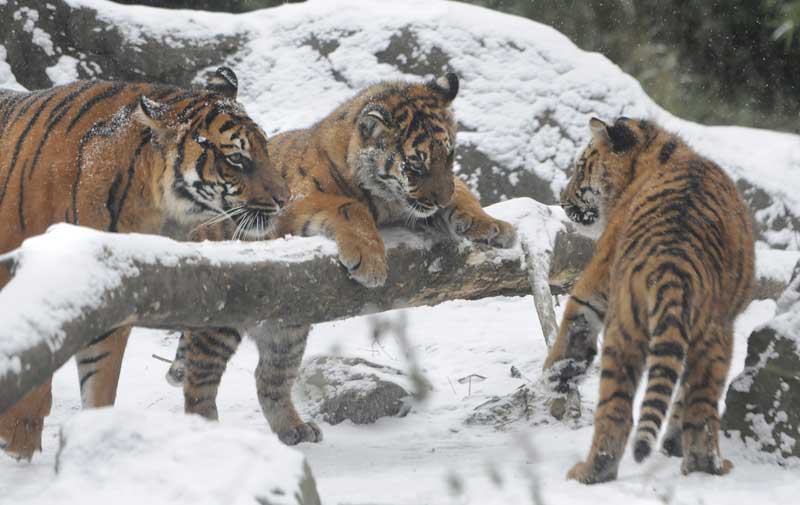 "Свадьбы" у тигра к определенному времени года четко не приурочены - их можно наблюдать в любом месяце, но все-таки чаще в конце зимы. Через 3,5 месяца в самом глухом непролазном месте уединившаяся тигрица приносит детенышей. Обычно их 2-3, иногда 1 или 4 и очень редко 5. Они очень беспомощны, весят не более 1 килограмма, но развиваются и растут быстро. В двухнедельном возрасте прозревают и слышат, в месяц тигрята вдвое тяжелее, они становятся шустрыми и любознательными, выкарабкиваются из логова и даже пытаются лазать по деревьям. К мясу начинают приобщаться уже в двухмесячном возрасте, но материнское молоко сосут до полугода. В этом возрасте детеныши достигают размеров большой собаки и целиком переходят на мясную пищу - отныне и до конца своих дней.